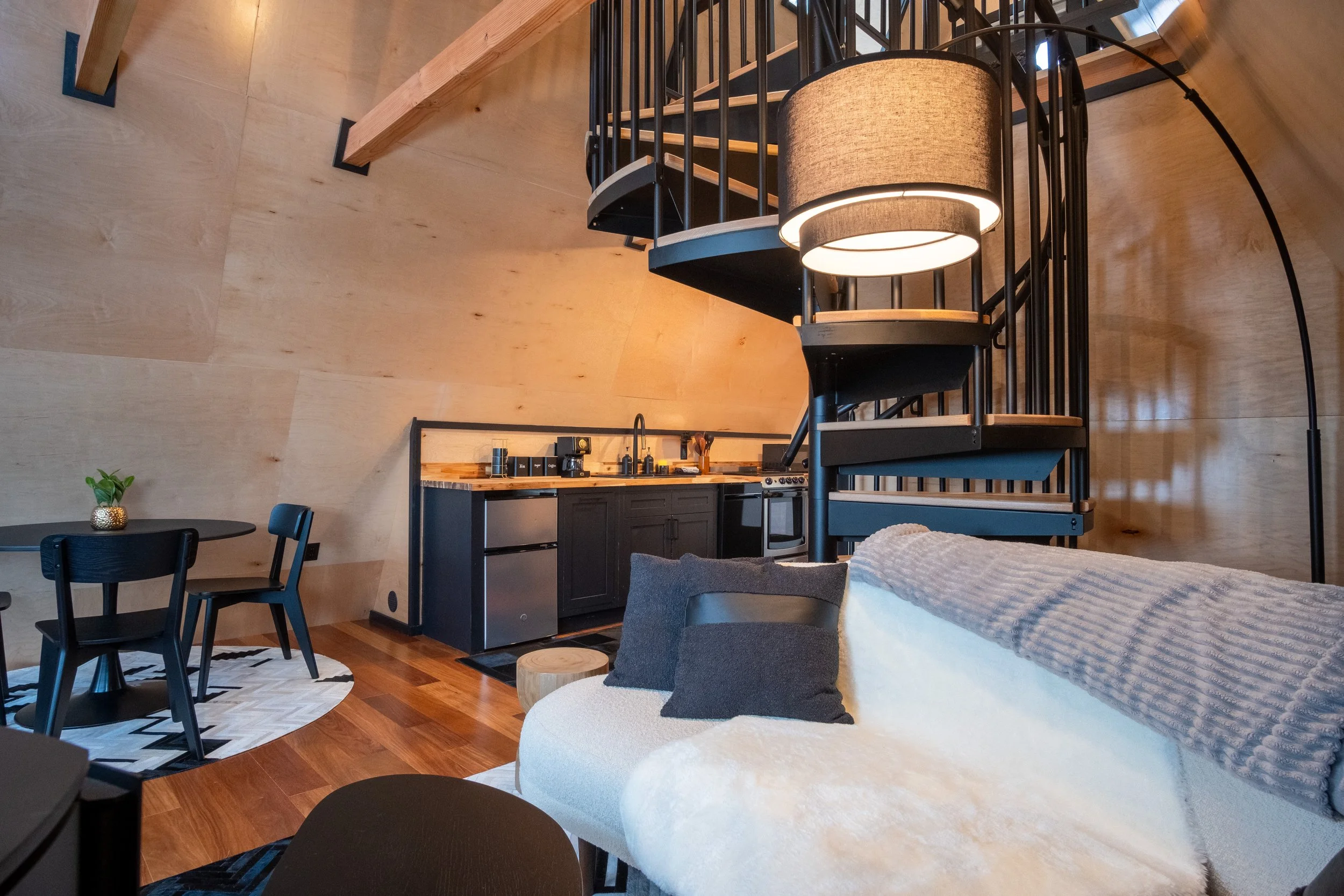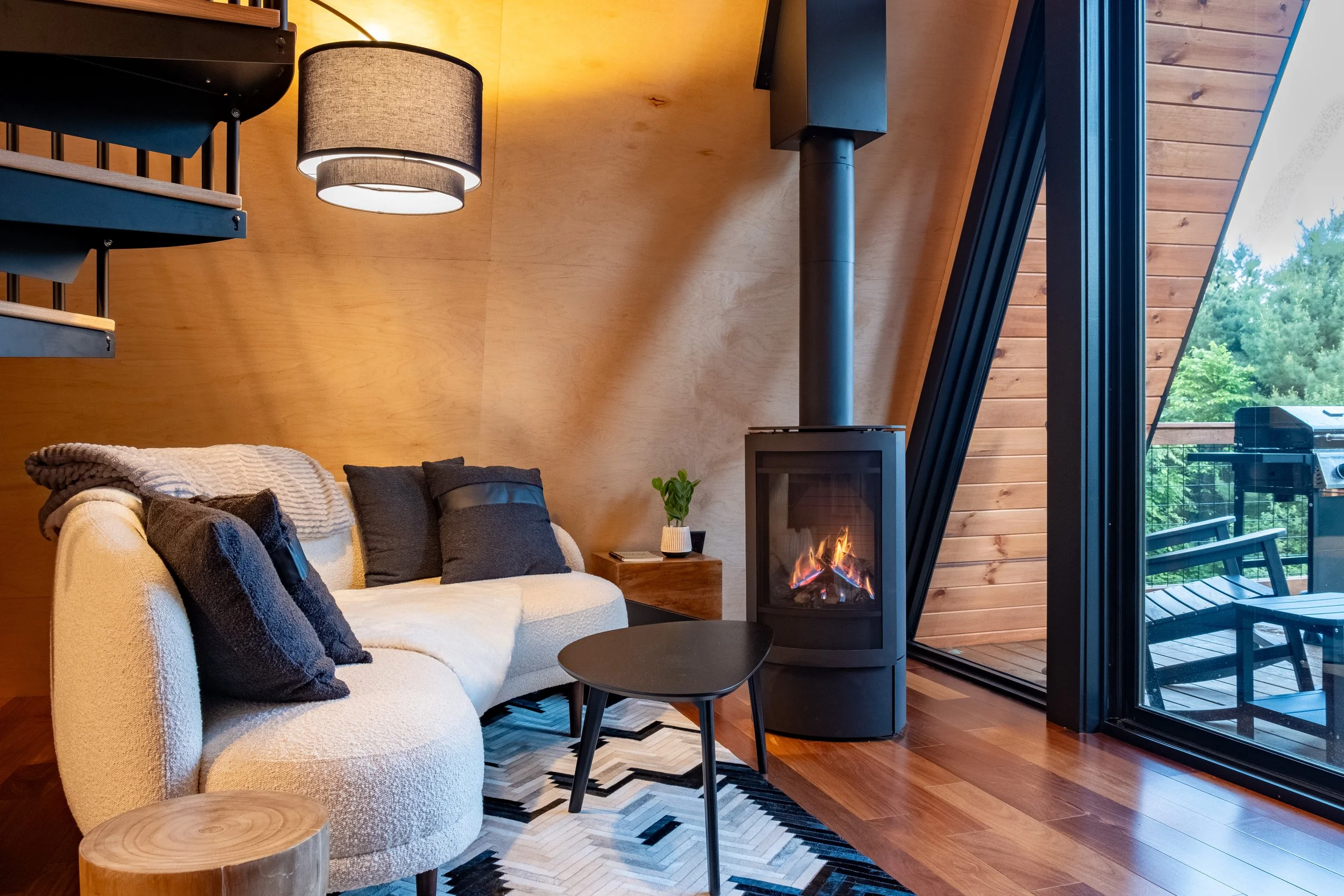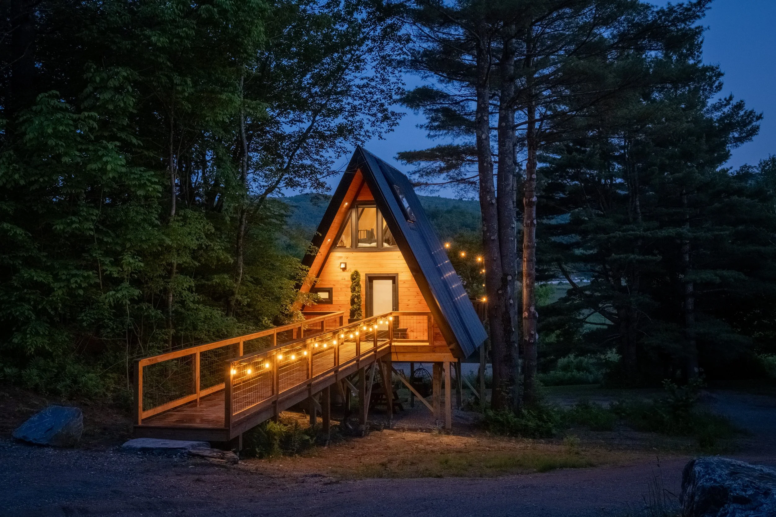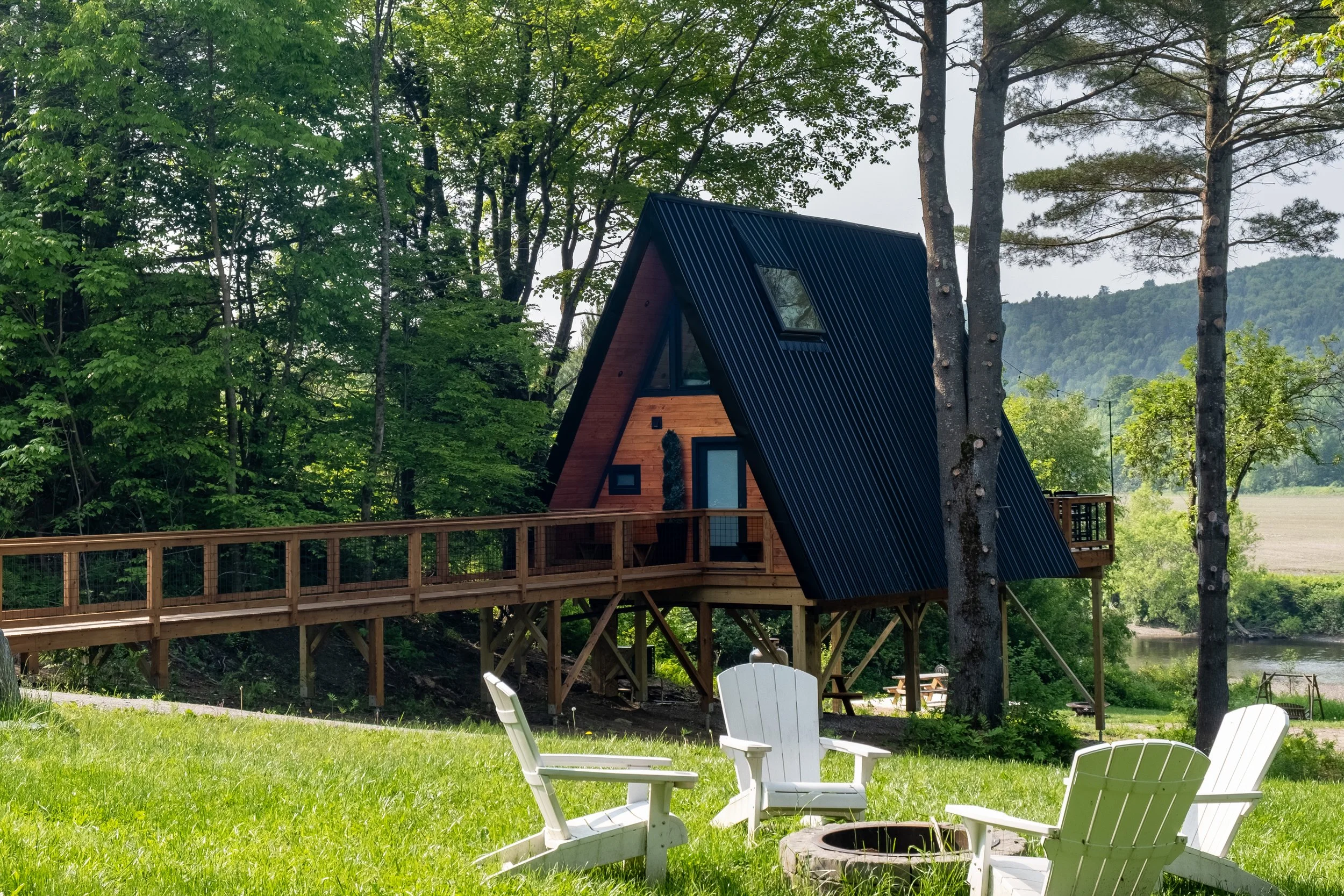Welcome to the newest gem at Uncommon Accommodations — a sleek, modern A-frame treehouse perched above the Lamoille River. This one-bedroom retreat offers a full kitchen, bathroom, cozy loft sleeping area, indoor fireplace, and a string-lit deck perfect for magical evenings under the stars. Whether you’re sipping coffee by the water or relaxing fireside, every moment here balances comfort, style, and serenity.